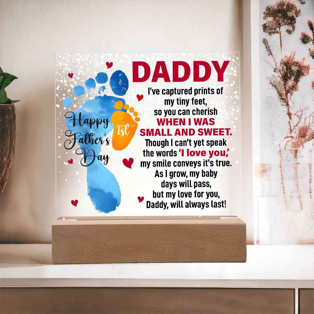 Your plaque will be crafted from premium acrylic with a professionally printed design for a polished look. It comes with a stylish wooden LED base, and you can choose between a USB plug-in option OR a cordless battery-operated option (requires 2 AAA batteries, not included). Both LED bases feature 7 vibrant colors, allowing the user to customize the lighting with various color changes and dynamic cycles.